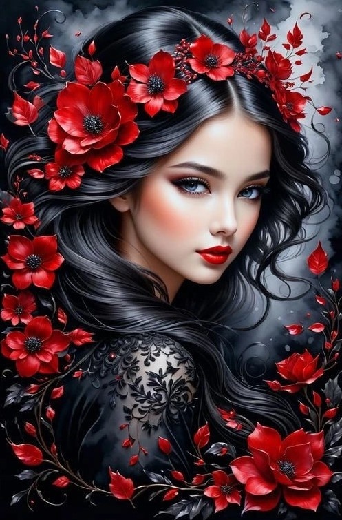 • (30x40) Haft Diamentowy Mozaika Diamond Painting Kwiaty Kobieta Czarne Włosy