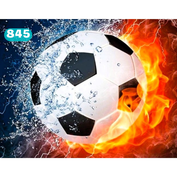 Piłka nożna, klasycznie biało-czarna, jest umieszczona w samym centrum obrazu. To jednak nie jest zwykły obraz piłki – cała scena jest otoczona żywymi elementami natury, które dodają obrazowi intensywności i mocy. Z jednej strony piłka jest otoczona wodą, której krople rozpryskują się w dynamiczny sposób, jakby piłka właśnie wpadła do wody. Z drugiej strony płonie ona w ogniu, który otacza ją żywymi płomieniami, podkreślającym gorącą pasję i energię, jaką niesie za sobą piłka nożna.